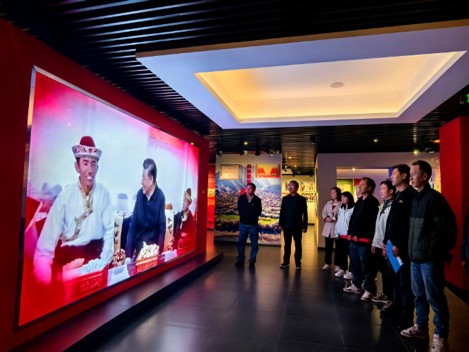 活動中,大家觀摩了嘎拉村“團(tuán)結(jié)頌”主題教育展覽館。展覽館以“團(tuán)結(jié)頌、振興頌、英雄頌、解放頌”四大主題展區(qū),通過一幅幅歷史照片和詳實的發(fā)展歷程展示,生動呈現(xiàn)了嘎拉村在黨的堅強領(lǐng)導(dǎo)下,各族群眾團(tuán)結(jié)奮斗,實現(xiàn)美麗鄉(xiāng)村建設(shè)的巨大變化。同時,黨支部依托展覽館黨員初心學(xué)堂電子平臺,開展黨建知識競賽,黨支部書記喬次仁圍繞總書記重要回信精神講黨課。